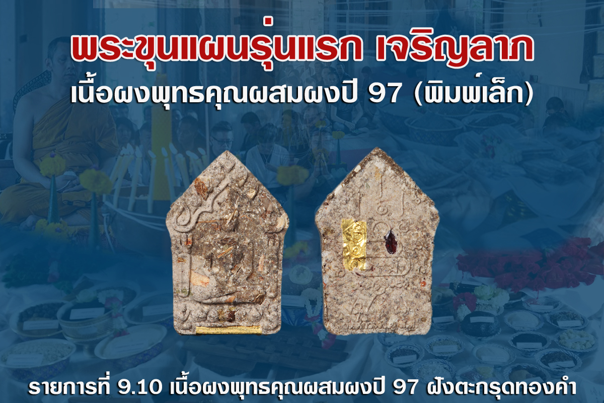 พระขุนแผนรุ่นแรกฯ เนื้อผงพุทธคุณผสมผงปี 97 (นำฤกษ์) - เนื้อผงพุทธคุณผสมผงปี 97 (พิมพ์ใหญ่) ปิดทองลองพิมพ์ / ตะกรุดทองคำคู่ - เนื้อผงพุทธคุณผสมผงปี 97 (พิมพ์เล็ก) ปิดทองลองพิมพ์ / ตะกรุดเงิน 1 - เนื้อผงพุทธคุณกดมือพิมพ์โบราณ ปิดทองลองพิมพ์ / ตะกรุดเงินคู่ |