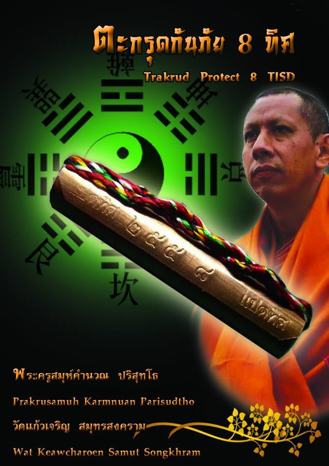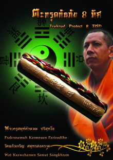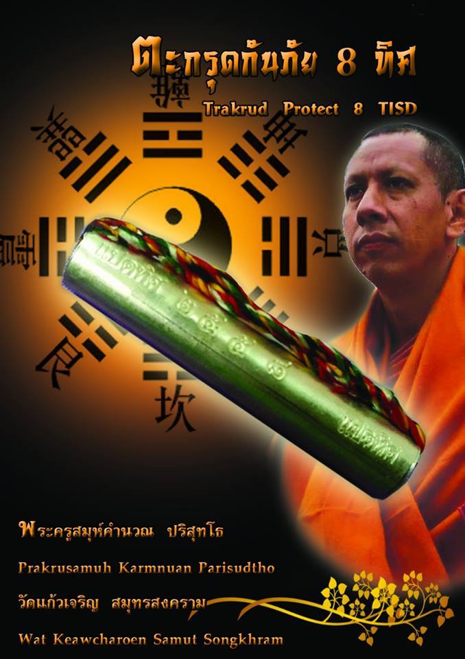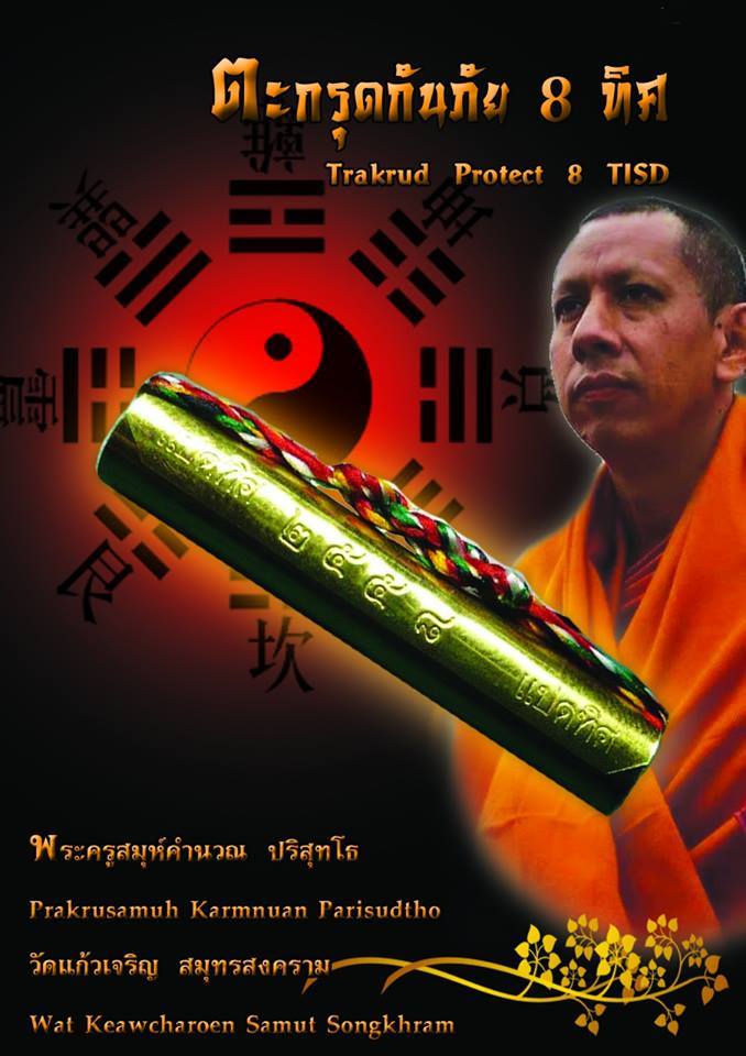 - ตระกรุดกันภัย 8 ทิศแบบปกติ (เนื้อเงิน 10 ดอก , เนื้อทองเหลือง 9 ดอก , เนื้อทองแดง 13 ดอก ) จารหมายเลข 888 กำกับที่ตะกรุด